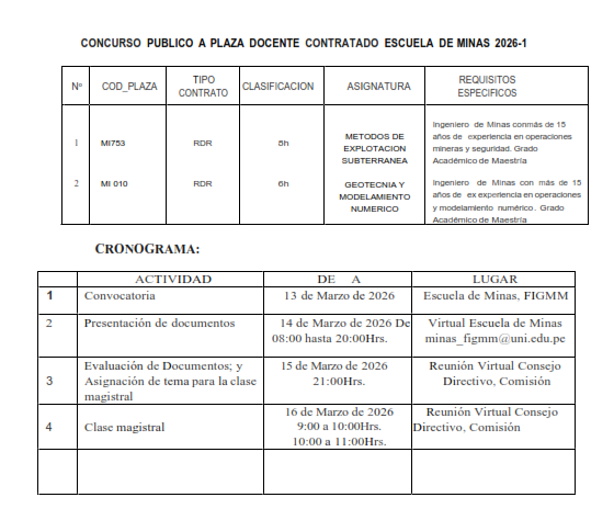 CONCURSO PUBLICO A PLAZA DOCENTE CONTRATADO- ESCUELA DE MINAS NOTICIASSin categoríaStudent storyCONCURSO PUBLICO A PLAZA DOCENTE CONTRATADO- ESCUELA DE MINAS figmmadmin Mar 13, 2026 739 views 0 comments CONVOCATORIA A CONCURSO PUBLICO PARA CONTRATO EN PLAZA DOCENTE Related Posts CONVOCATORIA A CONCURSO PUBLICO PARA CONTRATO EN PLAZA DOCENTE Feb 23, 2026 739 views CONVOCATORIA A CONCURSO PUBLICO DE DOCENTES CONTRATADO Feb 13, 2026 690 views Maskana Team: Innovación y Liderazgo Nov 27, 2025 558 views IV Seminario Carta Geológica Nacional 2025 Nov 27, 2025 519 views 149.º ANIVERSARIO – SEMANA DE ANIVERSARIO DE LA FIGMM Nov 12, 2025 514 views